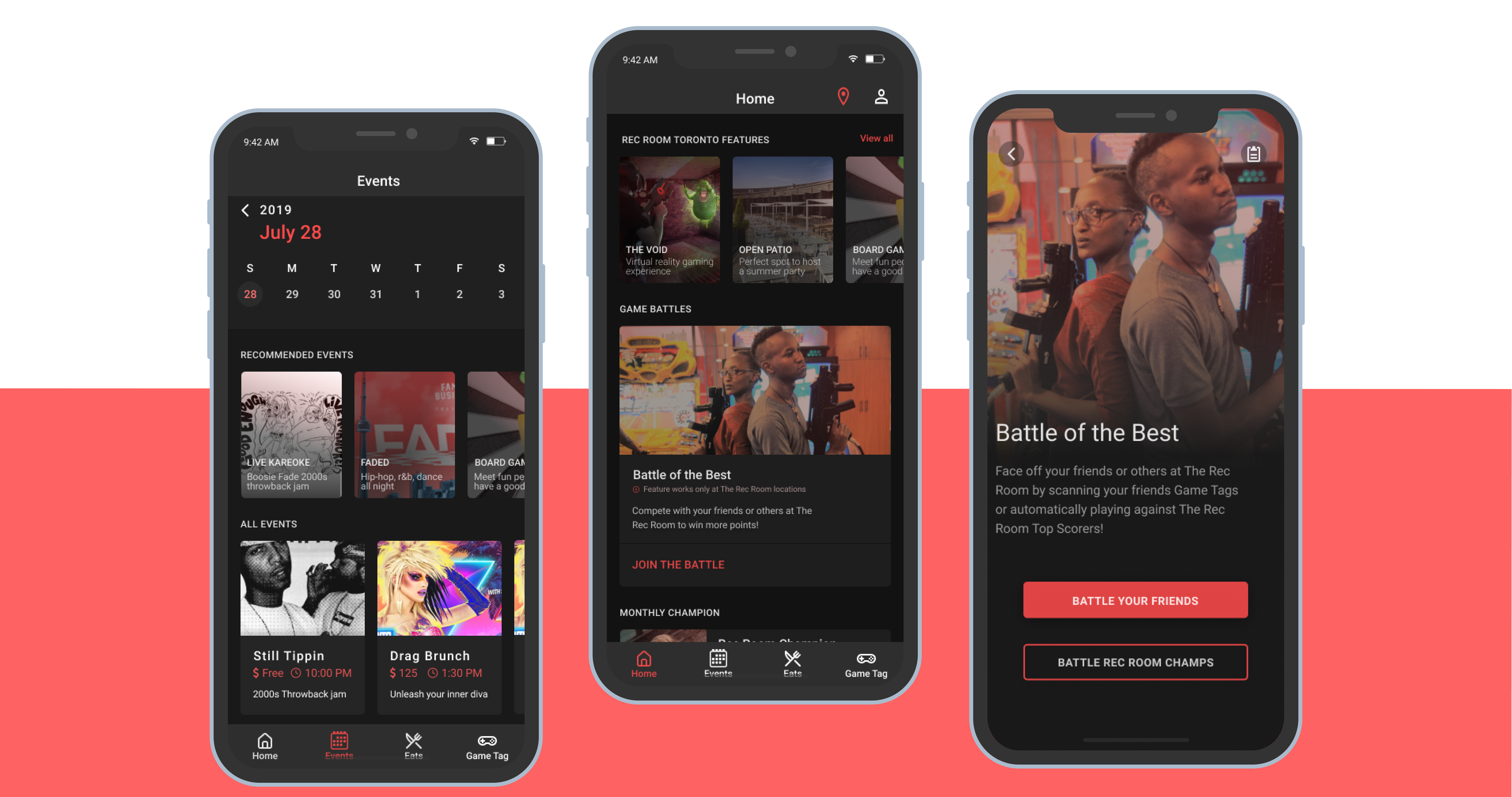 Strategized and designed an immersive mobile experience for users using Balsamiq, Figma, and InVision that incentivizes users to pay recurring visits to the Rec Room.