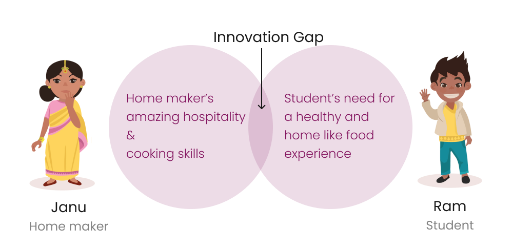 Homefood combines the skills of Janu and the needs of Ram to give birth to a business possibility. It gives students a cheap alternative to other restaurants while also providing a source of income to unemployed homemakers.